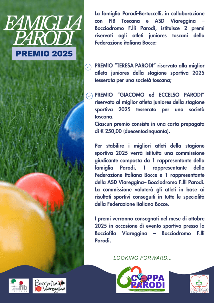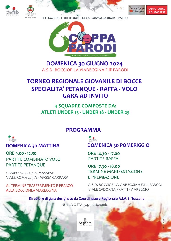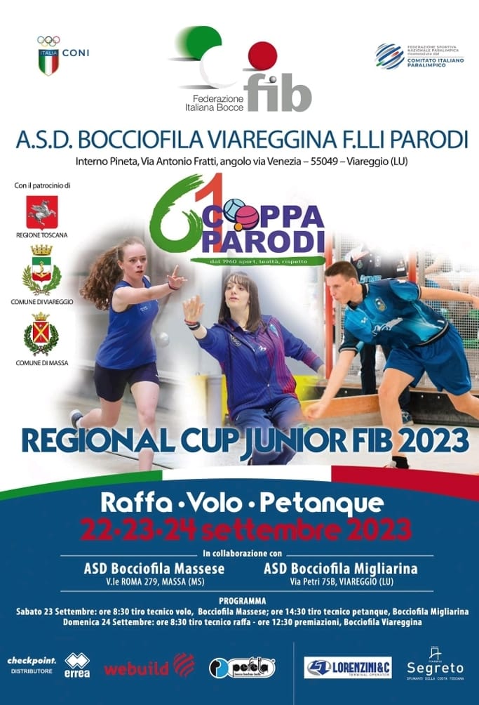 A Viareggio, il 23 e 24 Settembre prossimo si svolgerà un’importante manifestazione Boccistica Giovanile, la Regional Cup FIB2023 – 61ª Coppa Parodi, un vero e proprio campionato italiano di tiro tecnico a squadre per la categoria Under 18. Sui Bocciodromi di Viareggio per le specialità Raffa e Petanque e al bocciodromo di Massa per la specialità Volo, 16 rappresentative di altrettante regioni d’Italia battaglieranno due giorni per succedere al Piemonte, vincitore della scorsa edizione di una manifestazione che quest’anno assume il riconoscimento Federale di gara d’eccellenza per le bocce giovanili.